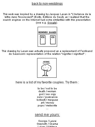 Subject : net art non-weddings By : Christophe Bruno 2002, http://www.unbehagen.com (participation)Date : 2002/06/16 Link : http://www.unbehagen.com/non-weddings/ http://www.unbehagen.com/non-weddings/help.php