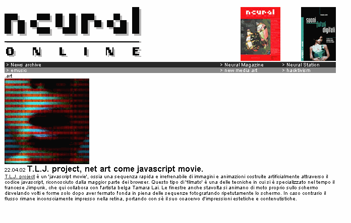 Subject : T.L.J. project, net art come javascript movie.By : Date : 2002/04/22 Link : http://www.neural.it/nnews/tlj.htm