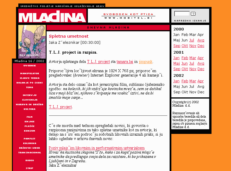 Subject : MLADINA : T.L.J. project in razpisa. By : Date : 2002/04/27 Link : http://www.mladina.si/dnevnik/18914/