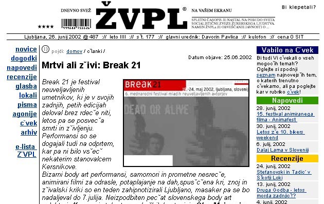 Subject : Mrtvi ali z˙ivi: Break 21By : Alenka LahajnarDate : 2002/06/25 Link : http://www.zvpl.com/clanek.asp?ID=1384