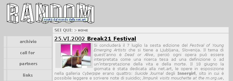 Subject : 25.VI.2002 Break21 FestivalBy : maria rita silvestriDate : 2002/06/25 Link : http://random.exibart.com/NotiziaStandard.asp?IDNotizia=18181&IDCategoria=3133