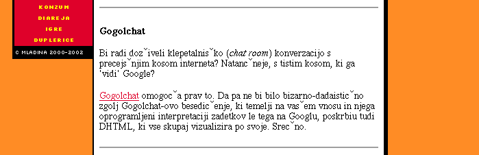 Subject : gogolchat From : http://www.mladina.si/dnevnik/29864/ Date : 2002/11/02 Link : http://www.mladina.si/dnevnik/29864/ ![]() Gogolchat Bi radi doz›iveli klepetalnis›ko (chat room) konverzacijo s precejs›njim kosom interneta? Natanc›neje, s tistim kosom, ki ga 'vidi' Google? Gogolchat omogoc›a prav to. Da pa ne bi bilo bizarno-dadaistic›no~ zgolj Gogolchat-ovo besedic›enje, ki temelji na vas›em vnosu in njega oprogramljeni interpretaciji zadetkov le tega na Googlu, poskrbiu tudi DHTML, ki vse skupaj vizualizira po svoje. Srec›no.
