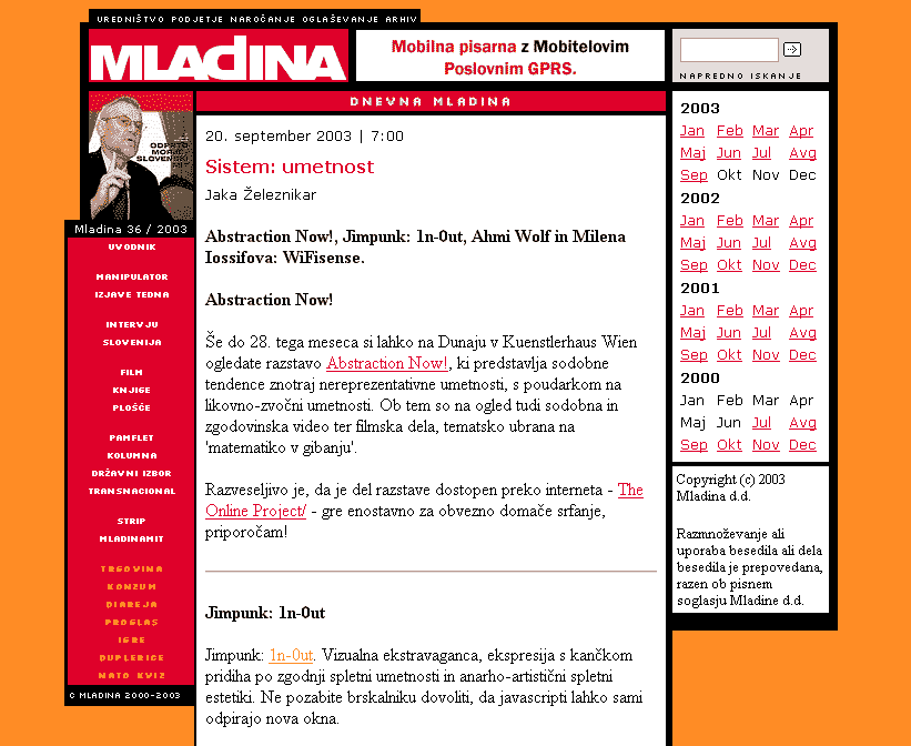 Subject :Abstraction Now!, From : Jaka eleznikar Date : 2003/09/20 Link : http://mladina.si/dnevnik/37219/