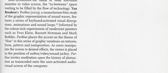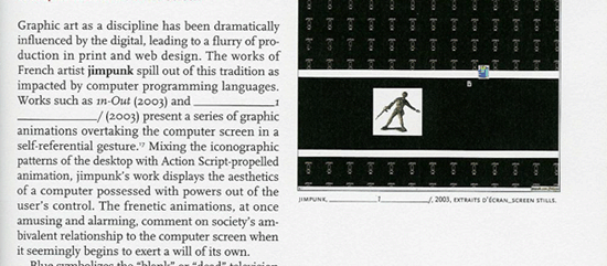 Subject : Parachute "Screen" #113 now out! From :valerie lamontagne Date : 2004/01/27 Link : http://www.parachute.ca/ The Screen of net.art (Texte seulement en anglais) By Valérie Lamontagne Dans cet essai, lauteure discute de la façon dont lécran dordinateur rompt avec lécran cinématographique conventionnel en le remplaçant par un écran avec de multiples fenêtres dont les éléments dynamiques suscitent lattention du regardeur. Lillusionnisme de la fenêtre est transformé par les net.artistes en un environnement en temps réel qui est dynamique, modulaire, réseautique et numérique. Ce survol sur le net.art souligne ce qui est propre au genre, à savoir la convergence des pratiques, lémergence de structures interactives, les récits elliptiques et les ordinateurs de programmation technologiques. In this article, the author discusses how the computer screen disrupts